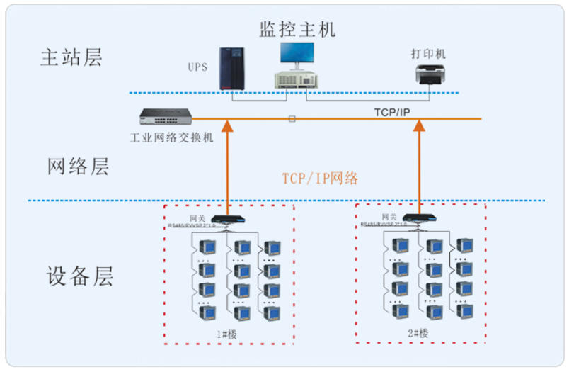 系統(tǒng)采用Acrel-5000能耗管理系統(tǒng),該系統(tǒng)主要采用分層分布式計算機網(wǎng)絡結構,如系統(tǒng)結構:站控管理層、網(wǎng)絡通訊層和現(xiàn)場設備層。其中上海環(huán)境監(jiān)測中心項目現(xiàn)場設備分布為1#樓及2#樓,該所有監(jiān)測點都在樓層強電井的配電箱內(nèi),所有儀表通過485屏蔽雙絞線鋪設至值班室,經(jīng)采集器至系統(tǒng)主機從而完成儀表數(shù)據(jù)的采集并管理。