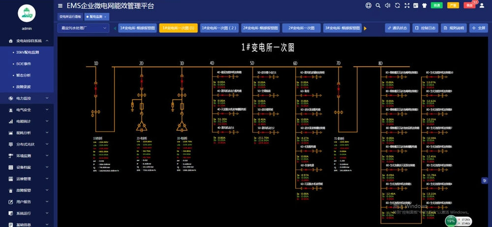 嘉定污水處理廠EMS電能管理系統(tǒng)項目分為三個低配間,兩個箱變和光伏設(shè)備,做到數(shù)據(jù)互通,電力數(shù)據(jù)實時顯示在電力一次圖上面。