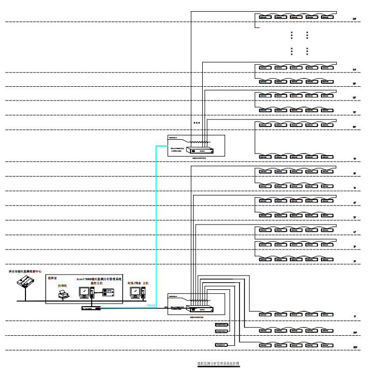 辦公主樓地上二十二層,地下兩層,合計(jì)102塊西安旌旗電子的直接接入型電能表,6塊安科瑞電氣的PZ96L-E4電能表,32塊安科瑞電氣的PZ72L-E4電能表,1塊RS485接口Modbus通訊協(xié)議的水表需要進(jìn)行能耗監(jiān)測(cè)。后臺(tái)位于一層的值班室內(nèi),因此針對(duì)本項(xiàng)目的性質(zhì),設(shè)計(jì)一套能耗系統(tǒng),并在值班室內(nèi)操作臺(tái)處配置一臺(tái)通訊管理機(jī),對(duì)地下配電室的安科瑞電表、遠(yuǎn)傳水表以及裙樓及辦公樓低層的西安旌旗電子電能表進(jìn)行采集。同時(shí)在9層弱電間再設(shè)置一臺(tái)內(nèi)置通訊管理機(jī)的數(shù)據(jù)采集箱,對(duì)高層部分的西安旌旗電子電能表進(jìn)行采集,從9層采集箱至1層值班室操作臺(tái)處后臺(tái)主機(jī)通過(guò)光纖進(jìn)行數(shù)據(jù)傳輸。電表及水表的數(shù)據(jù)采集后按照能耗分類分項(xiàng)原則進(jìn)行分析,同時(shí)根據(jù)西安市公共建筑能耗監(jiān)測(cè)系統(tǒng)技術(shù)規(guī)范DBJ61/T 97-2015將數(shù)據(jù)上傳至西安市公共建筑能耗監(jiān)測(cè)平臺(tái)。