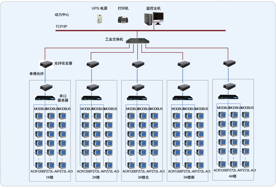 系統(tǒng)采用Acrel-2000型電力監(jiān)控系統(tǒng),整個(gè)系統(tǒng)采用網(wǎng)絡(luò)分布式結(jié)構(gòu),監(jiān)控主機(jī)位于2#樓前面地下一層的動(dòng)力中心中,其他5個(gè)配電室分別位于1#、2#、3#、4#地下一層(其中3#有南北兩個(gè)配電室),所有配電回路均配備安科瑞電力儀表PZ系列及ACR系列。該項(xiàng)目實(shí)現(xiàn)了淄博運(yùn)動(dòng)員公寓4個(gè)樓內(nèi)電力系統(tǒng)的智能管理。所有監(jiān)控設(shè)備均通過屏蔽雙絞線至各自配電室內(nèi)的通訊管理機(jī),再通過光電轉(zhuǎn)換器經(jīng)過光纖將數(shù)據(jù)傳輸至2#樓地下一層的動(dòng)力中心,從而實(shí)現(xiàn)遠(yuǎn)程監(jiān)控。