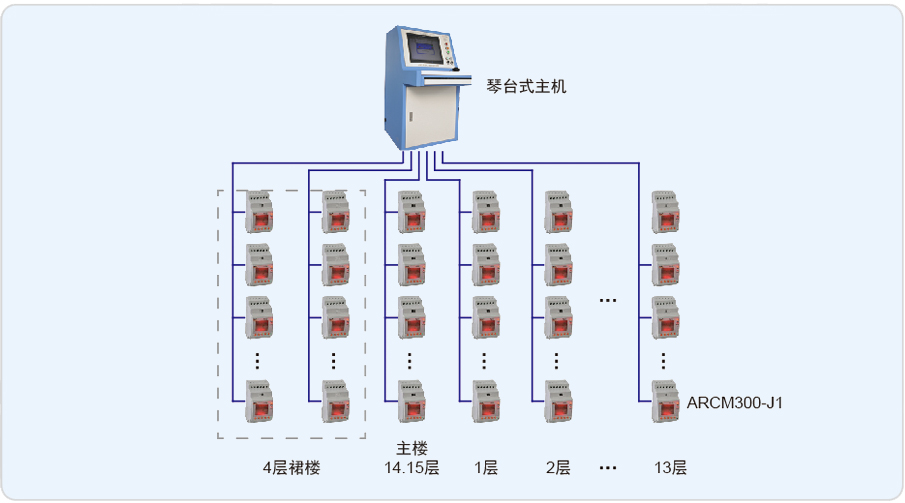 現(xiàn)場共有ARCM300-J1剩余電流式儀表280只,分別分布于15層主樓和4層裙樓樓層內(nèi),現(xiàn)場火災(zāi)探測器采用總線方式接至位于主樓1層消防控制室內(nèi)的 Acrel-6000琴臺式電氣火災(zāi)監(jiān)控系統(tǒng)。