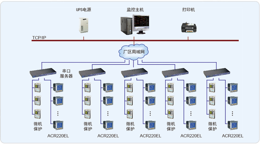 該系統(tǒng)總計有212只儀表(其中包括12只ACR230ELH、188只ACR220EL和12只ABB綜保),其中高壓室、發(fā)電機房、1#變電所的多功能儀表數(shù)據(jù)通過4根RS485總線直接上傳至監(jiān)控室;2#、3#變電所采用4根RS485總線,拉設(shè)至2#變電所通訊采集箱內(nèi),通過光纖上傳至監(jiān)控值班室;4#、5#變電所采用4根RS485總線,拉設(shè)至4#變電所通訊采集箱內(nèi),通過光纖上傳至監(jiān)控值班室,再通過工業(yè)網(wǎng)絡(luò)交換機將數(shù)據(jù)統(tǒng)一上傳至監(jiān)控主機。