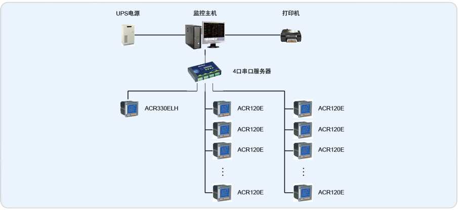 廠區(qū)配電中心為本項目提供一套高、低壓后臺監(jiān)控系統(tǒng),將對廠區(qū)內(nèi)電氣室中改造安裝的19塊智能電測儀表進行集中監(jiān)視。具體監(jiān)控數(shù)據(jù)為:用電量計量、實時測量相電壓、線電壓、有功功率、無功功率、視在功率、功率因數(shù)、頻率等數(shù)據(jù),能打印月度用電報表,并有歷史曲線的查詢(時間不小于30天),重要回路需要對其諧波進行測量。各參數(shù)及數(shù)據(jù)通過RS485總線,通過網(wǎng)絡送至配電中心的電工值班室(后臺監(jiān)控中心)。