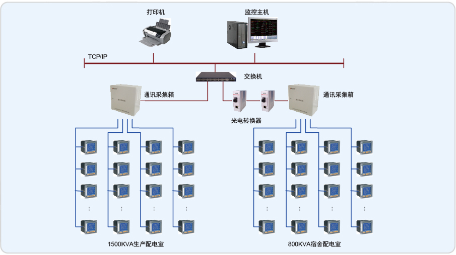 山東電力管道工程公司有兩個配電室:容量1500KVA的生產(chǎn)配電室和800KVA的宿舍配電室,兩個配電室距離約1500米,為實現(xiàn)配電系統(tǒng)的規(guī)范化管 理,對舊的配電系統(tǒng)進行改造,兩配電室內(nèi)的老式指針式儀表更換為上海安科瑞公司的網(wǎng)絡電力儀表,配套Acrel-2000電力監(jiān)控軟件對現(xiàn)場進行監(jiān)控,監(jiān)控室位于生產(chǎn)配電室內(nèi)。為滿足兩個配電室統(tǒng)一監(jiān)控的要求,容量1500KVA的生產(chǎn)配電室和800KVA的宿舍配電室通過一根單模四芯的光纖相連,經(jīng)光電轉(zhuǎn)換后接入網(wǎng)絡交換機,進而實現(xiàn)對現(xiàn)場數(shù)據(jù)的采集,存儲,處理,實時顯示以及歷史查詢。