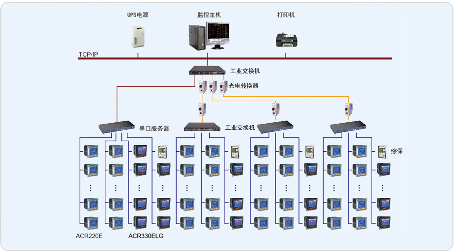 藍(lán)礬化工配電系統(tǒng)管理監(jiān)控系統(tǒng)主要實(shí)現(xiàn)對藍(lán)礬化工的主控配電室、消防配電室、造氣0.4KV配電室開關(guān)柜內(nèi)安裝的213只ACR120EL、11只ACR330ELG、80只電力儀表 、4只綜保的監(jiān)測和控制。系統(tǒng)通過安裝在工廠電網(wǎng)中主要受電點(diǎn)和樞紐配電柜中的電能監(jiān)測儀表采集到配電網(wǎng)的各項(xiàng)電力參數(shù)信號,再將信號轉(zhuǎn)換為數(shù)據(jù)傳輸?shù)接?jì)算機(jī)中,計(jì)算機(jī)對數(shù)據(jù)進(jìn)行存儲、計(jì)算和分類存儲到數(shù)據(jù)庫中,然后通過計(jì)算軟件將電能以報(bào)表、圖表的形式進(jìn)行展示。電能管理人員可通過計(jì)算機(jī)看到電能的輸入、傳輸、消耗的全過程。