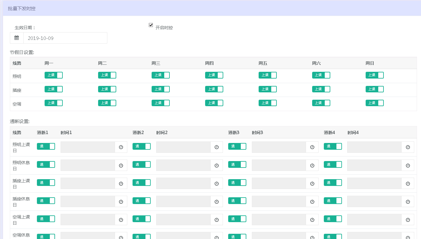 為方便學(xué)校管理學(xué)生作息,系統(tǒng)可以設(shè)置多個時間段,定時控制宿舍斷電送電時間。每個回路可單獨(dú)設(shè)置,可以區(qū)分上課日和雙休日,支持8個時段,參數(shù)下發(fā)至電表,由電表獨(dú)立控制回路通斷,不受通訊問題影響。