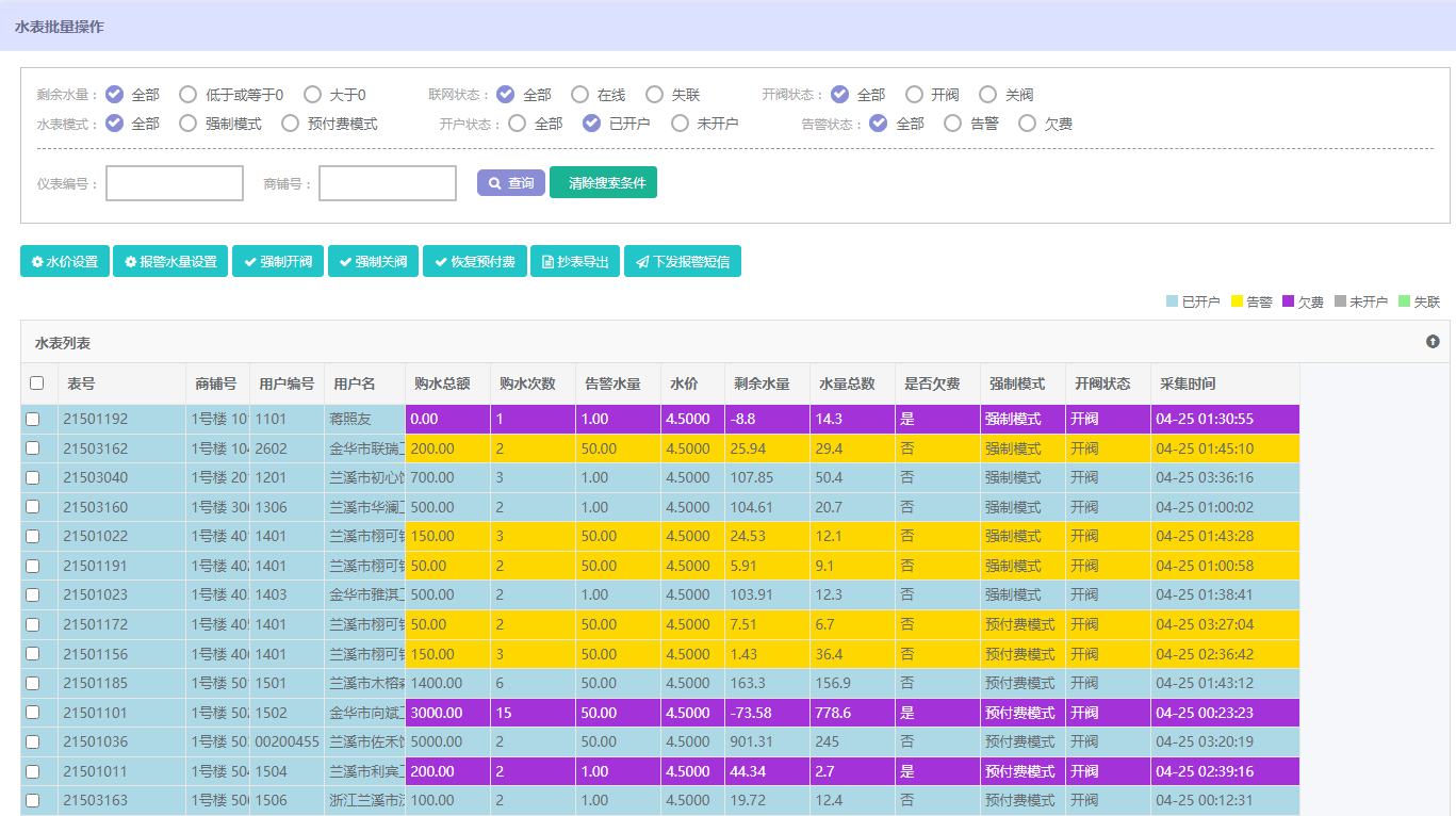 批量遠(yuǎn)程操作場景中,系統(tǒng)提供了多項功能,針對開戶、報警1、報警2、欠費(fèi)、未開戶、失聯(lián)狀態(tài)都有不同的顏色顯示:1.電價下發(fā);2.設(shè)置下發(fā);3.保電(強(qiáng)制合閘);4.恢復(fù)預(yù)付費(fèi)(欠費(fèi)自動跳閘);5.拉閘(強(qiáng)制斷電);6.抄表導(dǎo)出(導(dǎo)出當(dāng)前所有表狀態(tài)為XLS)
