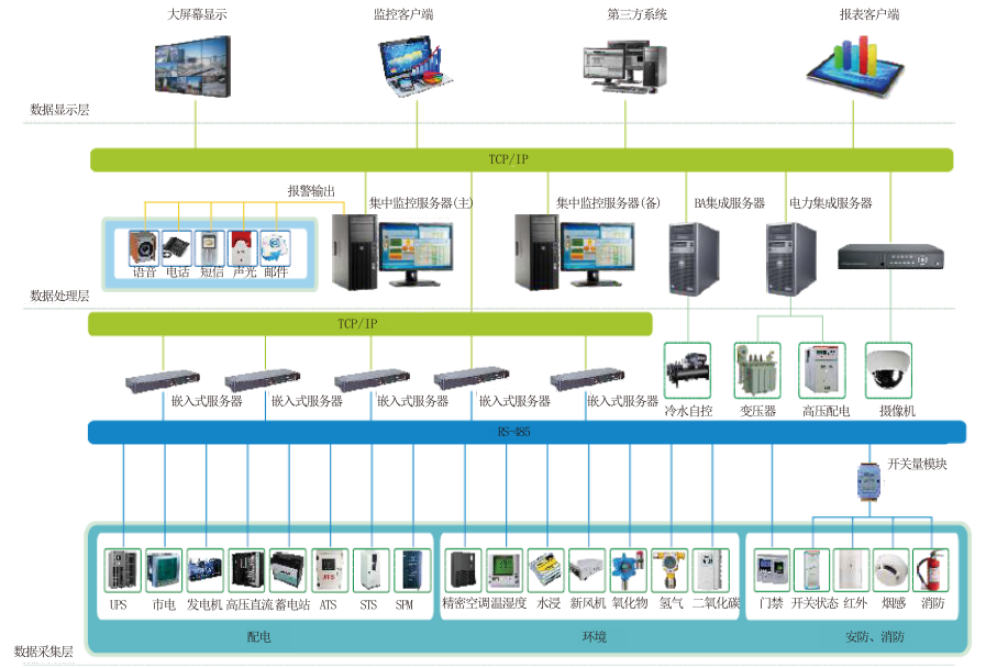 基礎設施集中監(jiān)控采用一體化監(jiān)控采集系統(tǒng)(運行在嵌入式服務器上),系統(tǒng)主要功能有: