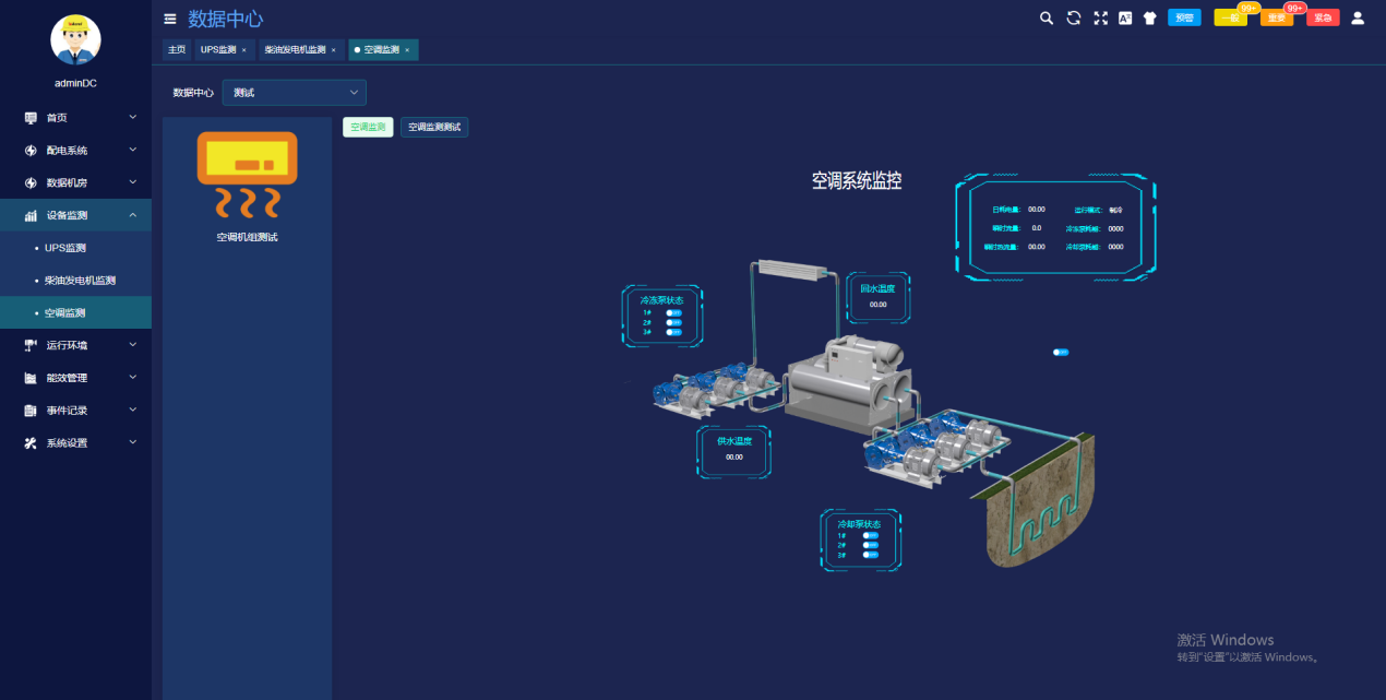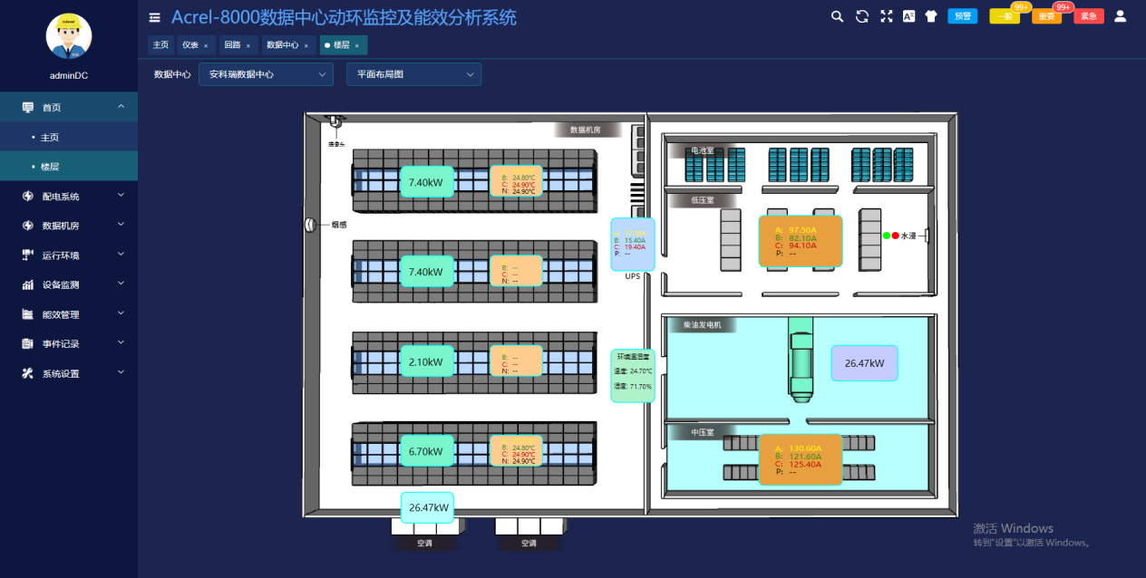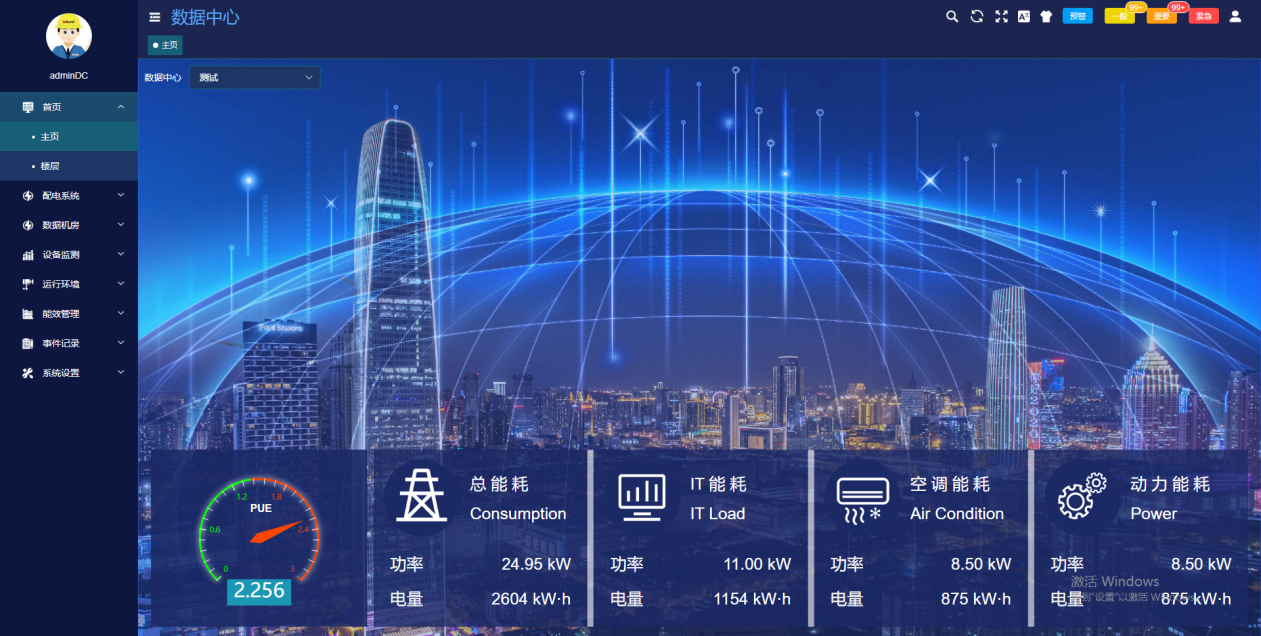默認(rèn)打開(kāi)系統(tǒng)的“主頁(yè)”界面。顯示該數(shù)據(jù)中心的實(shí)時(shí)PUE值,總能耗,IT能耗,空調(diào)能耗,動(dòng)力能耗。