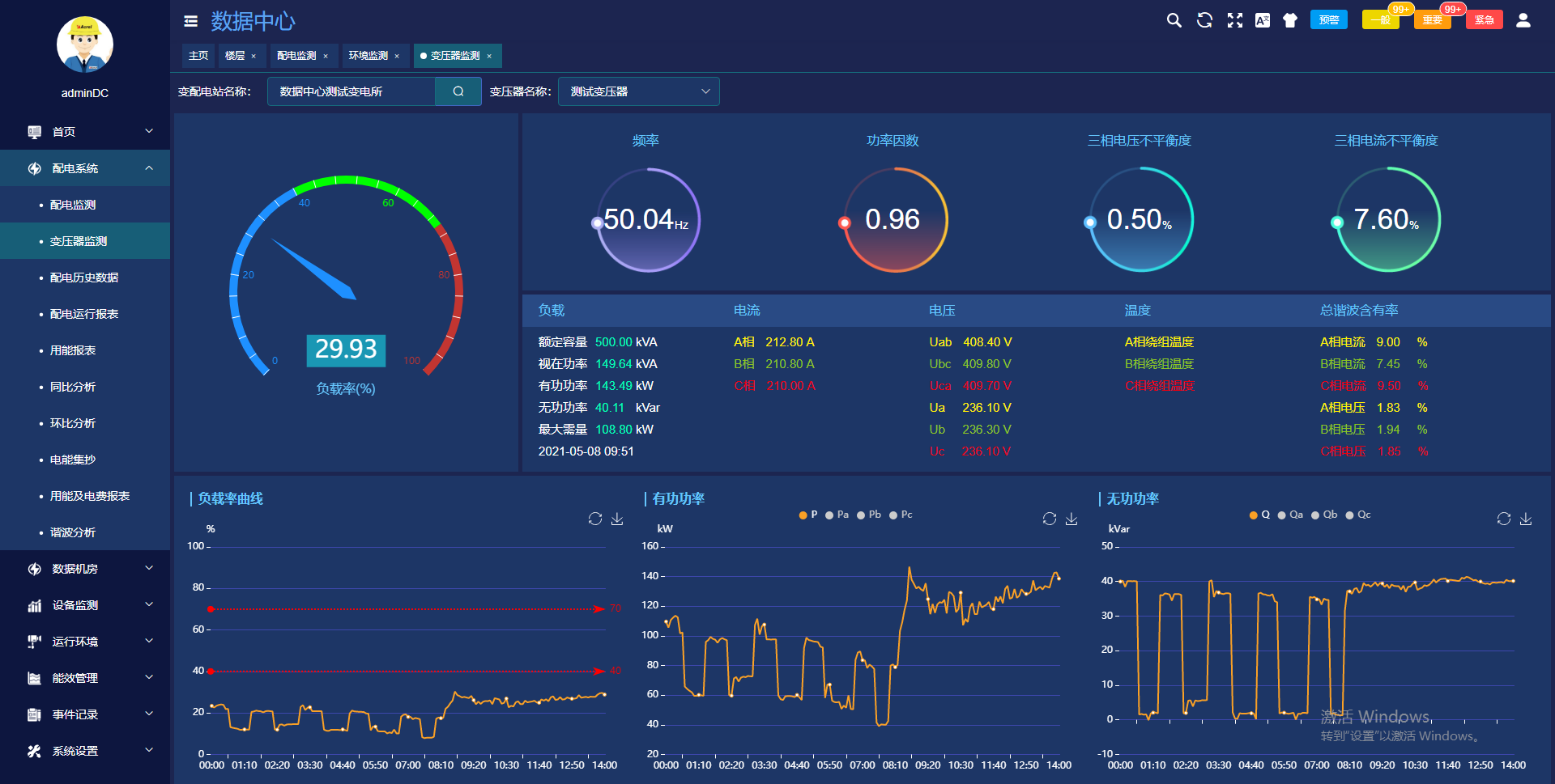 變壓器監(jiān)測(cè)監(jiān)測(cè)頁(yè)面實(shí)時(shí)監(jiān)測(cè)各變壓器各項(xiàng)參數(shù),包括福賊率。頻率,功率因數(shù),三相不平衡度等,并且顯示歷時(shí)曲線圖,數(shù)據(jù)實(shí)時(shí)變化。幫助用戶直觀監(jiān)測(cè)各變壓器運(yùn)行狀態(tài)。
