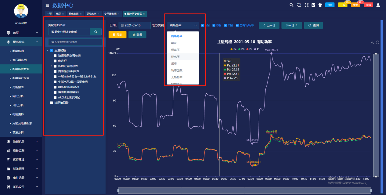 配電歷史數(shù)據(jù)可以展示每個(gè)配電回路的電流,電壓,功率因數(shù)等參數(shù)。并且可以通過(guò)日期,查詢歷史數(shù)據(jù)。