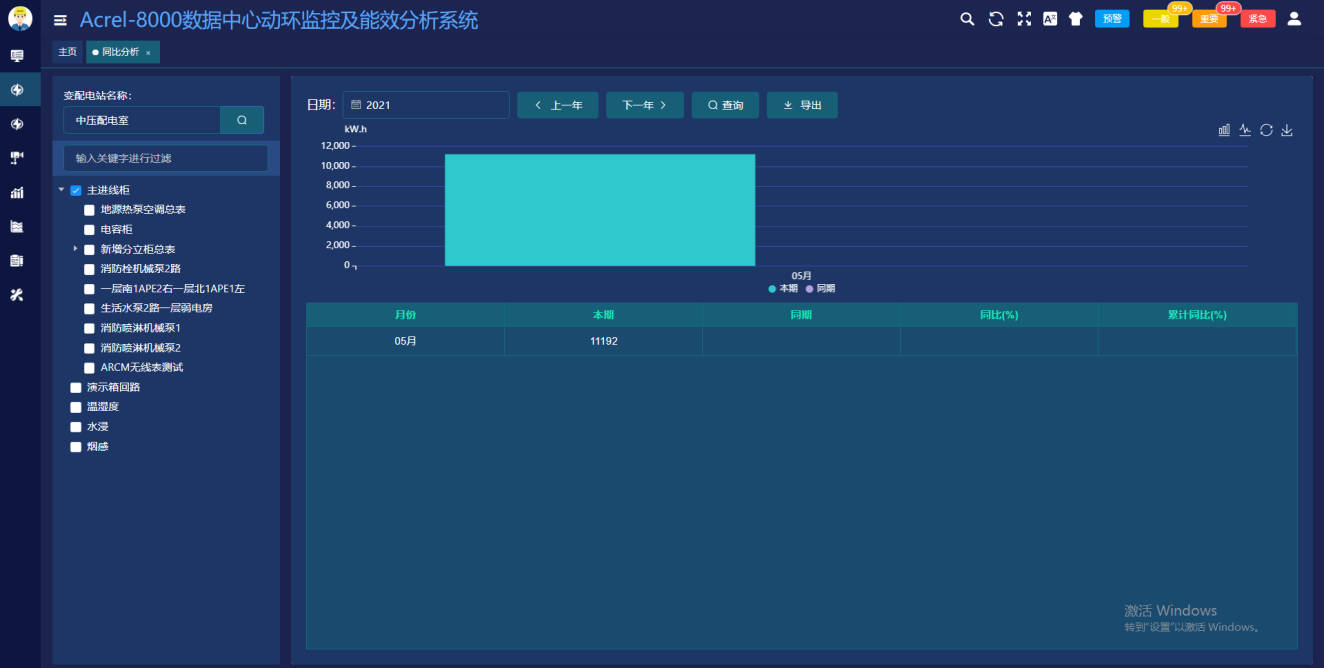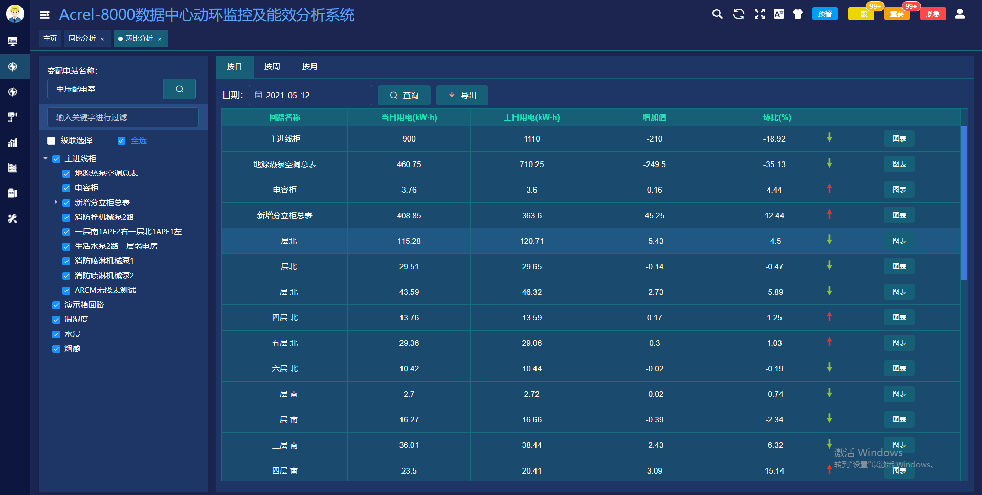 顯示各個(gè)用電回路。每日、每周、每月的環(huán)比用能情況。顯示增長(zhǎng)或者下降比例。