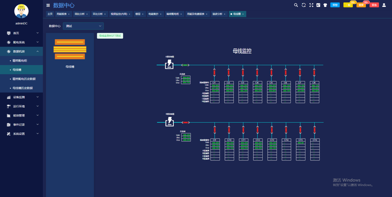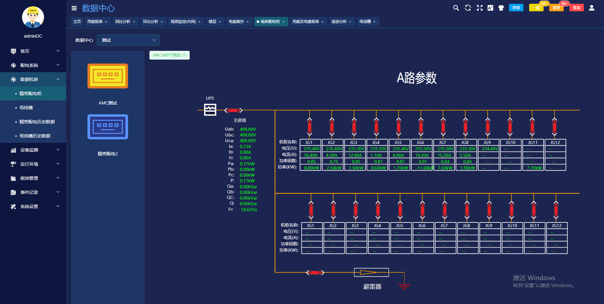 精密配電柜,通過(guò)SVG圖,將所有機(jī)柜的電壓,電流,功率,功率因數(shù)等參數(shù)顯示在圖中。