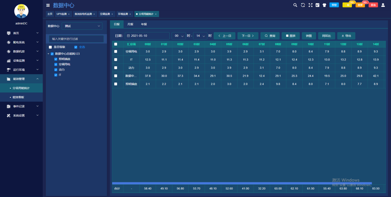 顯示當(dāng)前數(shù)據(jù)中心,IT、空調(diào)、照明動(dòng)力用電各時(shí)段的用電情況。