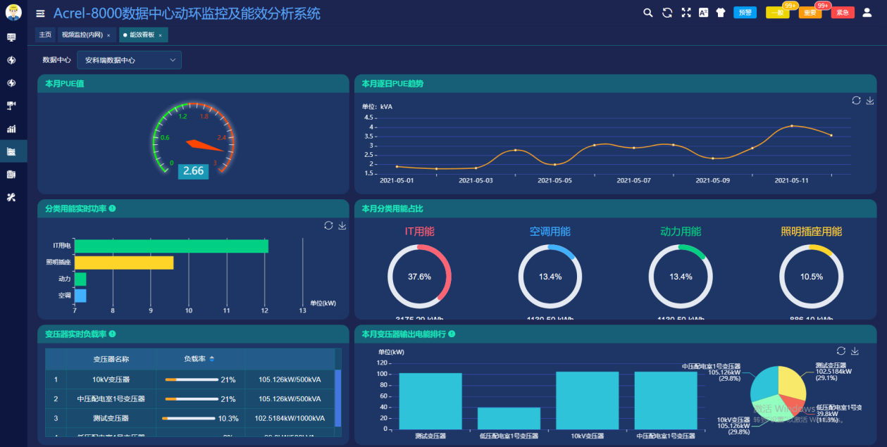能效看板實(shí)時(shí)顯示當(dāng)前數(shù)據(jù)中心PUE值以及歷史PUE曲線。并且顯示各分項(xiàng)用能的用能情況及用能排行。監(jiān)測(cè)各變壓器運(yùn)行及負(fù)載情況,給出本月變壓器輸出電能排行。