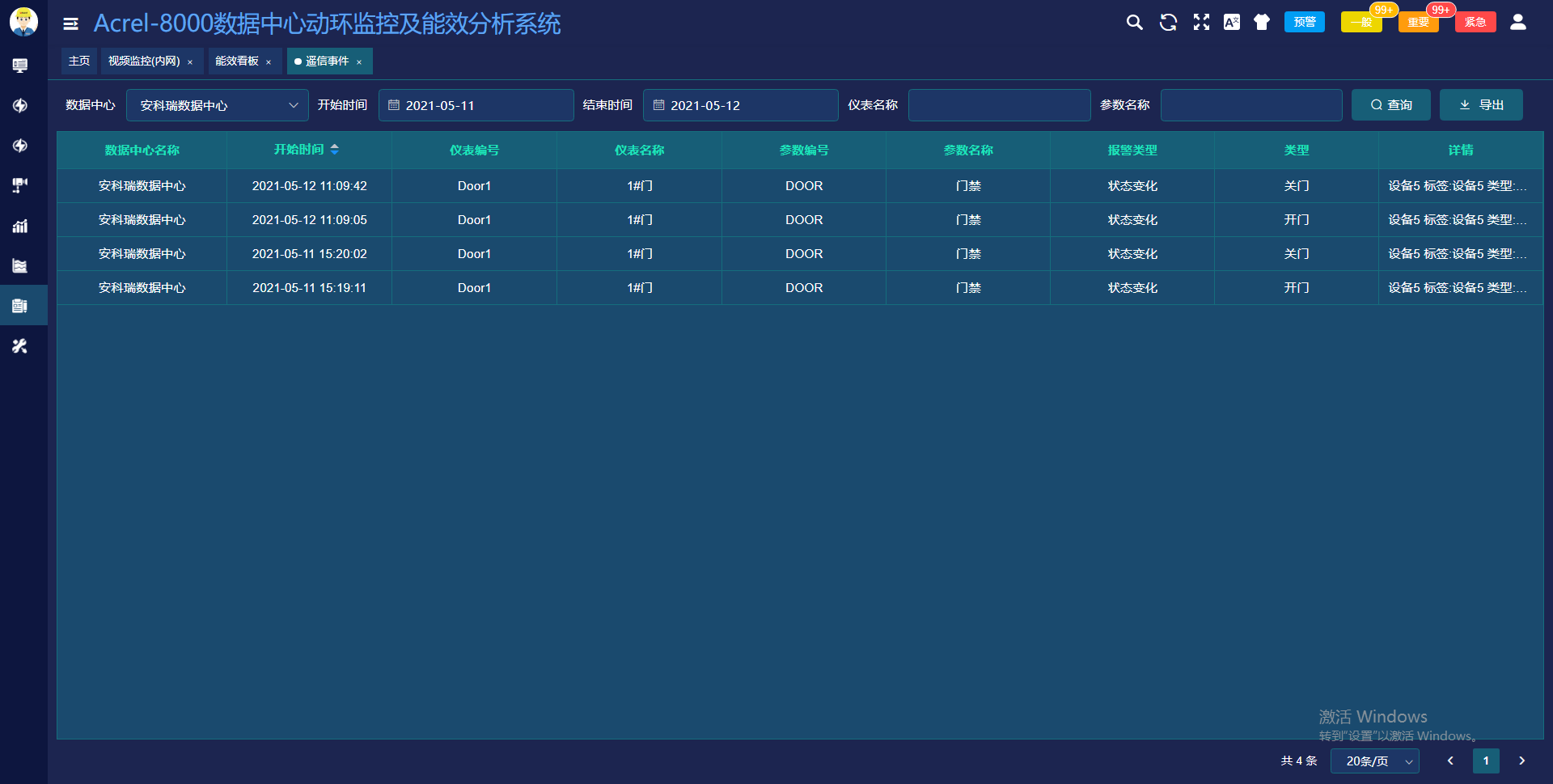 顯示當(dāng)前數(shù)據(jù)中心各遙測(cè)量、如門禁、煙霧、水浸等狀態(tài)變化的報(bào)警情況。