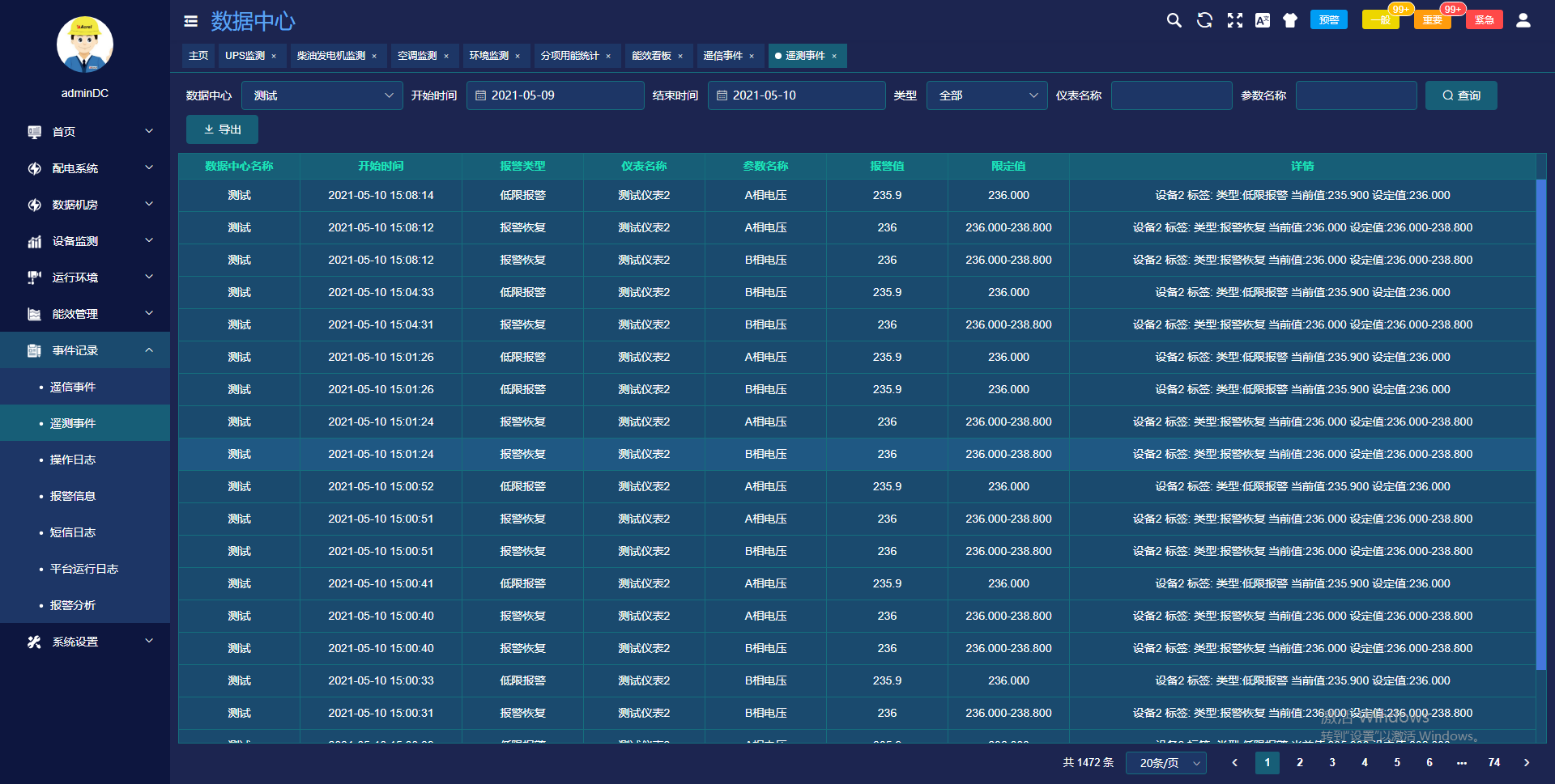 顯示當(dāng)前數(shù)據(jù)中心各遙測(cè)量、如電流、電壓、功率等電參量越線的報(bào)警情況。