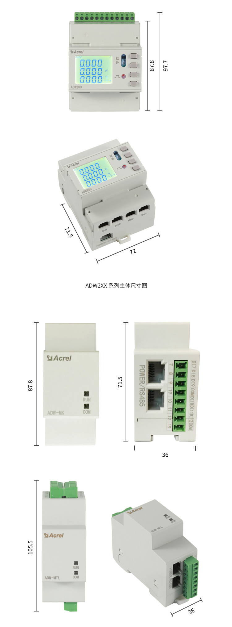 ADW2xx系列導(dǎo)軌式多回路電力儀表方便用戶進(jìn)行用電監(jiān)測、集抄和管理??伸`活安裝于配電箱內(nèi),實(shí)現(xiàn)對不同區(qū)域和不同負(fù)荷的分項(xiàng)電能計(jì)量,統(tǒng)計(jì)和分析。