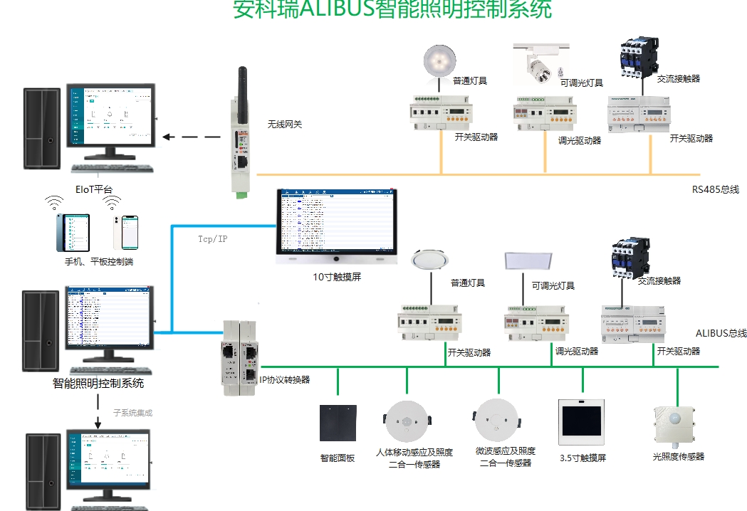 智能照明控制系統(tǒng)是安科瑞新一代自有知識產(chǎn)權(quán)的照明控制解決方案,基于成熟的RS485通訊控制技術(shù)。同時創(chuàng)新地引入了載波偵聽和沖突碰撞檢測機制,多機間的實現(xiàn)了實時雙向通訊。線材使用的超六類屏蔽網(wǎng)線,一次性解決通訊與供電問題。整個系統(tǒng)由輸出設(shè)備、輸入設(shè)備和系統(tǒng)元件。輸出設(shè)備負責接收和處理傳感器傳送的信號,并執(zhí)行相應的操作,如開/ 關(guān)燈、調(diào)節(jié)燈的亮度。輸入設(shè)備負責根據(jù)現(xiàn)場手動操作,或探測光線、人體運動等變化,向驅(qū)動器發(fā)出相應的控制信號。系統(tǒng)元件主要負責搭建系統(tǒng)平臺,如IP協(xié)議轉(zhuǎn)換器、中繼器等。