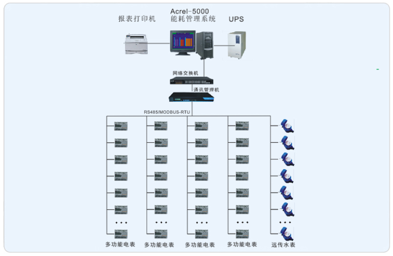 系統(tǒng)采用Acrel-5000型能耗檢測(cè)系統(tǒng),整個(gè)系統(tǒng)采用網(wǎng)絡(luò)分布式結(jié)構(gòu),監(jiān)控主機(jī)位于旋極科技大廈一樓機(jī)房?jī)?nèi),現(xiàn)場(chǎng)電表在每個(gè)樓層的南北區(qū)內(nèi)。水表分布在每層的男女廁所的豎井里。所有配電回路均配備安科瑞電力儀表DTSY系列及積成光電直讀系列水表。該項(xiàng)目實(shí)現(xiàn)了旋極科技大廈主辦公樓的能耗檢測(cè)。所有監(jiān)控設(shè)備均通過屏蔽雙絞線至一樓的通訊管理機(jī)再通過網(wǎng)線連接到主機(jī)從而實(shí)現(xiàn)遠(yuǎn)程監(jiān)控。