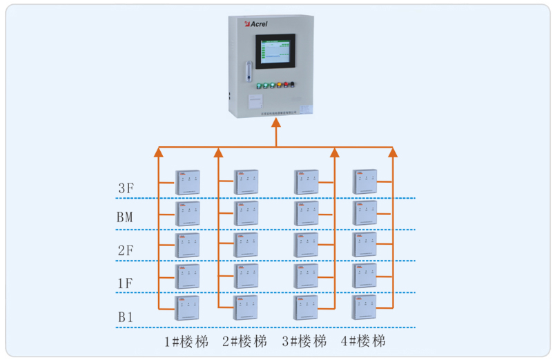 系統(tǒng)采用安科瑞防火門監(jiān)控系統(tǒng),該系統(tǒng)主要采用分層分布式網(wǎng)絡(luò)結(jié)構(gòu),系統(tǒng)結(jié)構(gòu)為:站控管理層、網(wǎng)絡(luò)通訊層和現(xiàn)場設(shè)備層。其中黃巖博物館項目現(xiàn)場設(shè)備分布為B1至3F常閉防火門。該系統(tǒng)監(jiān)控所有樓道內(nèi)的常閉防火門且實時監(jiān)測防火門狀態(tài),如有異常會后臺報警。所有監(jiān)測模塊通過二總線鋪設(shè)至消防控制室,防火門監(jiān)控主機從而完成對監(jiān)測模塊的采集并監(jiān)控。