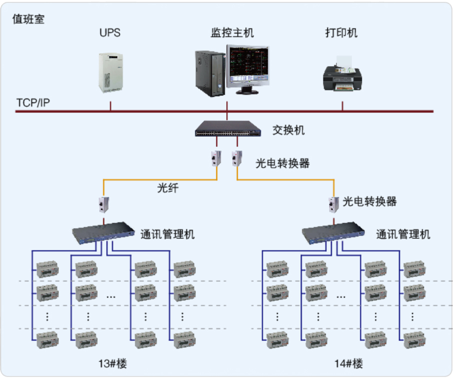 該項(xiàng)目有兩棟樓,均為六層,一共有532個(gè)房間,其中13#棟彝學(xué)院289個(gè)房間,14#棟藏學(xué)院243個(gè)房間,采用我司ADF100單相多用戶電能表195個(gè),分為24條RS485總線接至通訊管理機(jī),通訊管理機(jī)通過(guò)光纖拉至值班室連接到Acrel-3000預(yù)付費(fèi)電能管理系統(tǒng)后臺(tái),實(shí)現(xiàn)總線上儀表與監(jiān)控主機(jī)的數(shù)據(jù)連通。該系統(tǒng)為學(xué)校宿舍項(xiàng)目解決用電問(wèn)題提供了真實(shí)可靠的依據(jù),取得了較好的管理水平。