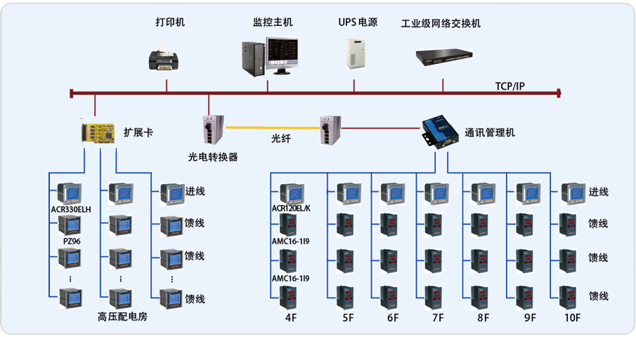 整個系統(tǒng)采用分布式結構,在上海東方電視臺變電所監(jiān)控室放置監(jiān)控主機及通訊采集裝置,現(xiàn)場各回路的儀表采用屏蔽雙絞線以總線型方式連接至通訊采集裝置,通訊管理機連接至交換機,其中劇場中設備用光纖連接至監(jiān)控室。