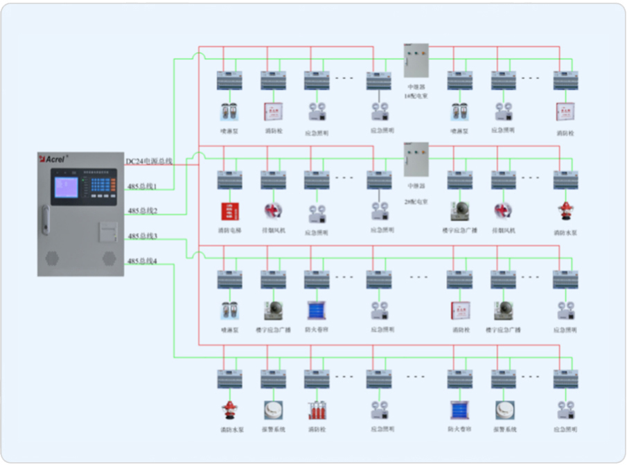 安科瑞電氣于2015年為該項(xiàng)目提供AFPM100小型消防設(shè)備電源監(jiān)控系統(tǒng)解決方案,該系統(tǒng)采用消防設(shè)備電源狀態(tài)監(jiān)控器+電壓/電流傳感器的兩層結(jié)構(gòu)組網(wǎng)模式,從而簡化了系統(tǒng)結(jié)構(gòu)設(shè)計。系統(tǒng)組網(wǎng)共分為站控管理層、網(wǎng)絡(luò)通訊層、現(xiàn)場設(shè)備層三層,該項(xiàng)目通訊總線共接入4條通訊總線,總線在樓層配電箱手拉手串接后,接入壁掛式后臺,組成消防設(shè)備電源監(jiān)控系統(tǒng)的大動脈。