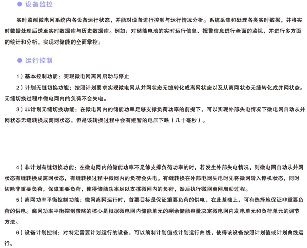 微電網(wǎng)能量管理控制系統(tǒng)用于保障微電網(wǎng)的穩(wěn)定和經(jīng)濟(jì)優(yōu)化運(yùn)行。其是一種計(jì)算機(jī)系統(tǒng),包括提供基本支持服務(wù)的軟件平臺,以及提供使微電網(wǎng)內(nèi)發(fā)電、配電、用電設(shè)備有效運(yùn)行所需功能的一套應(yīng)用軟件,是微電網(wǎng)監(jiān)控系統(tǒng)核心,擔(dān)負(fù)著系統(tǒng)電源管理、負(fù)荷管理以及統(tǒng)計(jì)分析、評估等功能。微電網(wǎng)微電網(wǎng)能量管理控制系統(tǒng)基本功能包括數(shù)據(jù)信息采集和處理、數(shù)據(jù)庫管理、人機(jī)界面、設(shè)備控制等。系統(tǒng)控制功能包括微網(wǎng)運(yùn)行基礎(chǔ)控制、計(jì)劃無縫切換控制、外部故障下的無縫切換控制、離網(wǎng)功率平衡優(yōu)化控制、功率波動(dòng)平滑控制等。系統(tǒng)應(yīng)用功能包括分布式電源的運(yùn)行分析與展示、微網(wǎng)運(yùn)行效益分析、有功功率整體優(yōu)化控制、無功電壓整體優(yōu)化控制、電能質(zhì)量優(yōu)化控制等。
