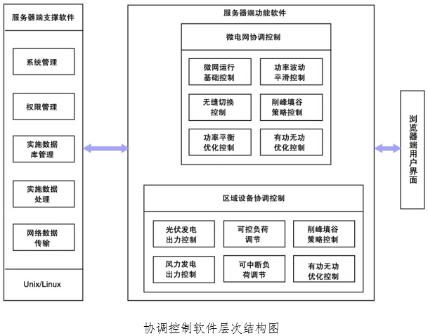 協(xié)調(diào)控制器采用B/S結(jié)構(gòu),包括硬件控制器、功能控制軟件和瀏覽器用戶工作界面。協(xié)調(diào)控制器的軟件體系結(jié)構(gòu)如下圖所示。協(xié)調(diào)控制器的服務(wù)器端包括支撐軟件和功能軟件兩部分。功能軟件包括微電網(wǎng)協(xié)調(diào)控制和設(shè)備協(xié)調(diào)控制。微電網(wǎng)協(xié)調(diào)控制功能包括微網(wǎng)運(yùn)行基礎(chǔ)控制、無縫切換控制、功率平衡優(yōu)化控制、功率波動(dòng)平滑控制、有功功率整體優(yōu)化控制、無功電壓整體優(yōu)化控制、電能質(zhì)量優(yōu)化控制等。設(shè)備協(xié)調(diào)控制功能包括光伏發(fā)電出力控制、可控負(fù)荷調(diào)節(jié)、可中斷負(fù)荷調(diào)節(jié)、有功無功優(yōu)化控制。協(xié)調(diào)控制器的瀏覽器端是用戶工作界面,可觀察協(xié)調(diào)控制功能軟件工作狀態(tài)、配置參數(shù)、控制工作模式等。