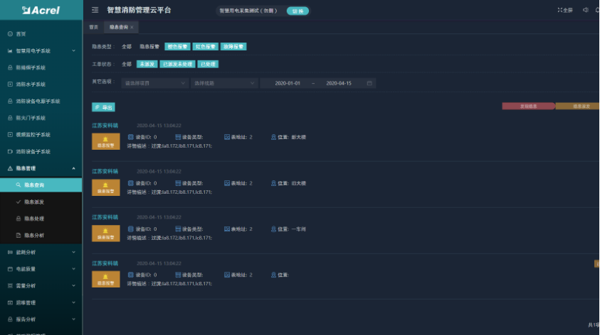 隱患管理功能包括了隱患查詢、隱患派發(fā)、隱患處理和隱患分析四個模塊??梢圆榭吹卿浻脩粝碌乃许椖康碾[患信息,并進行派發(fā)和處理操作,且對所有隱患進行統(tǒng)計分析。