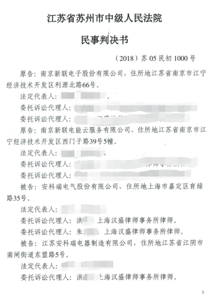 近日安科瑞收到江蘇省蘇州市中級人民法院(以下簡稱“蘇州中院”)的《民事判決書》((2018)蘇 05 民初 1000 號),就原告南京新聯(lián)電子股份有限公司、南京新聯(lián)電能云服務有限公司(以下簡稱“新聯(lián)公司”)與被告安科瑞電氣股份有限公司、江蘇安科瑞電器制造有限公司(以下簡稱“安科瑞”)侵害發(fā)明專利權糾紛一案作出判決。