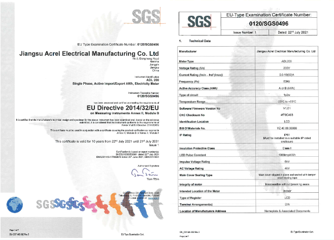 After SGS (UK) MID technical experts comprehensively, rigorously and carefully guide and review Acrel din rail energy meters, it is confirmed that the quality of ADL200 single-phase din rail energy meter produced by Jiangsu Acrel Electrical Manufacturing Co., LTD. complies with MID related standards, and on July 22, 2021, SGS (Finland) agency officially issued MID certificate(Certificate No. 0120/SGS0496) to our company. The MID certificate of Acrel ADL400 three-phase din rail energy meter is also in the process of obtaining evidence, which is expected to be completed in early September.