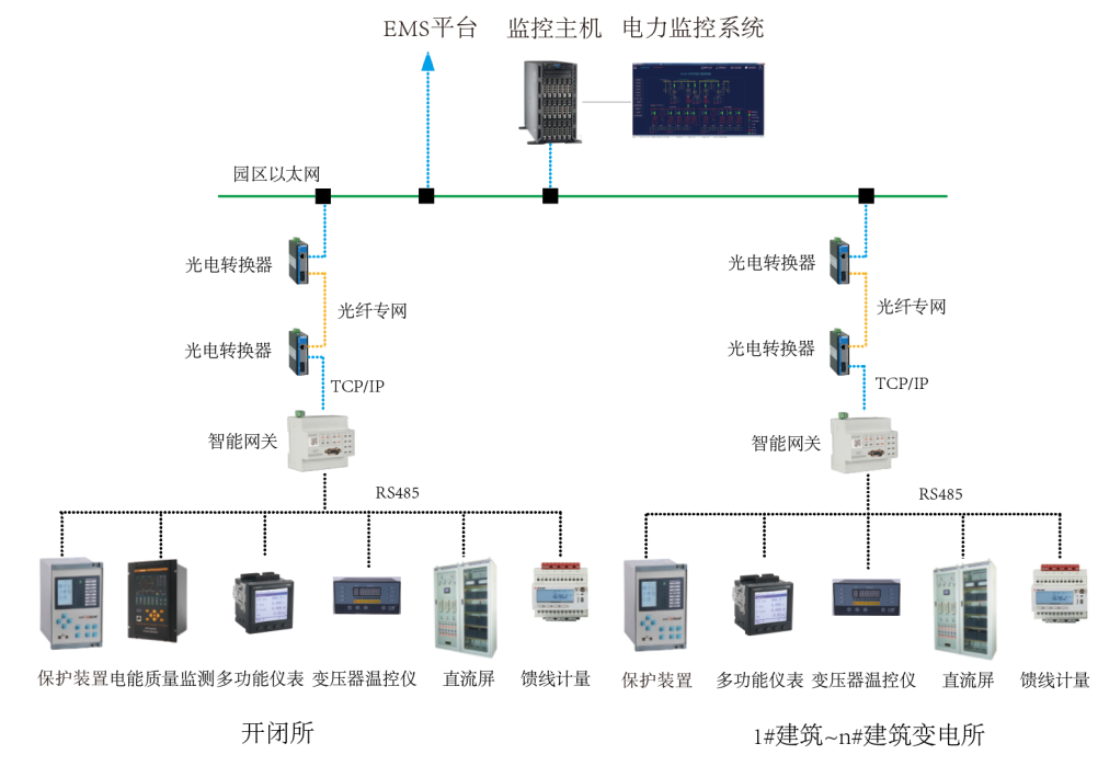 電力監(jiān)控系統(tǒng)實現(xiàn)對園區(qū)變電站、配電房內斷路器、變壓器、柴油發(fā)電機以及其它重要設備進行監(jiān)視、測量、記錄、報警等功能,并與保護設備和遠方控制中心及其他設備通信,實時掌握園區(qū)變電站和配電房運行狀況,快速排除故障,保障園區(qū)供電可靠性。