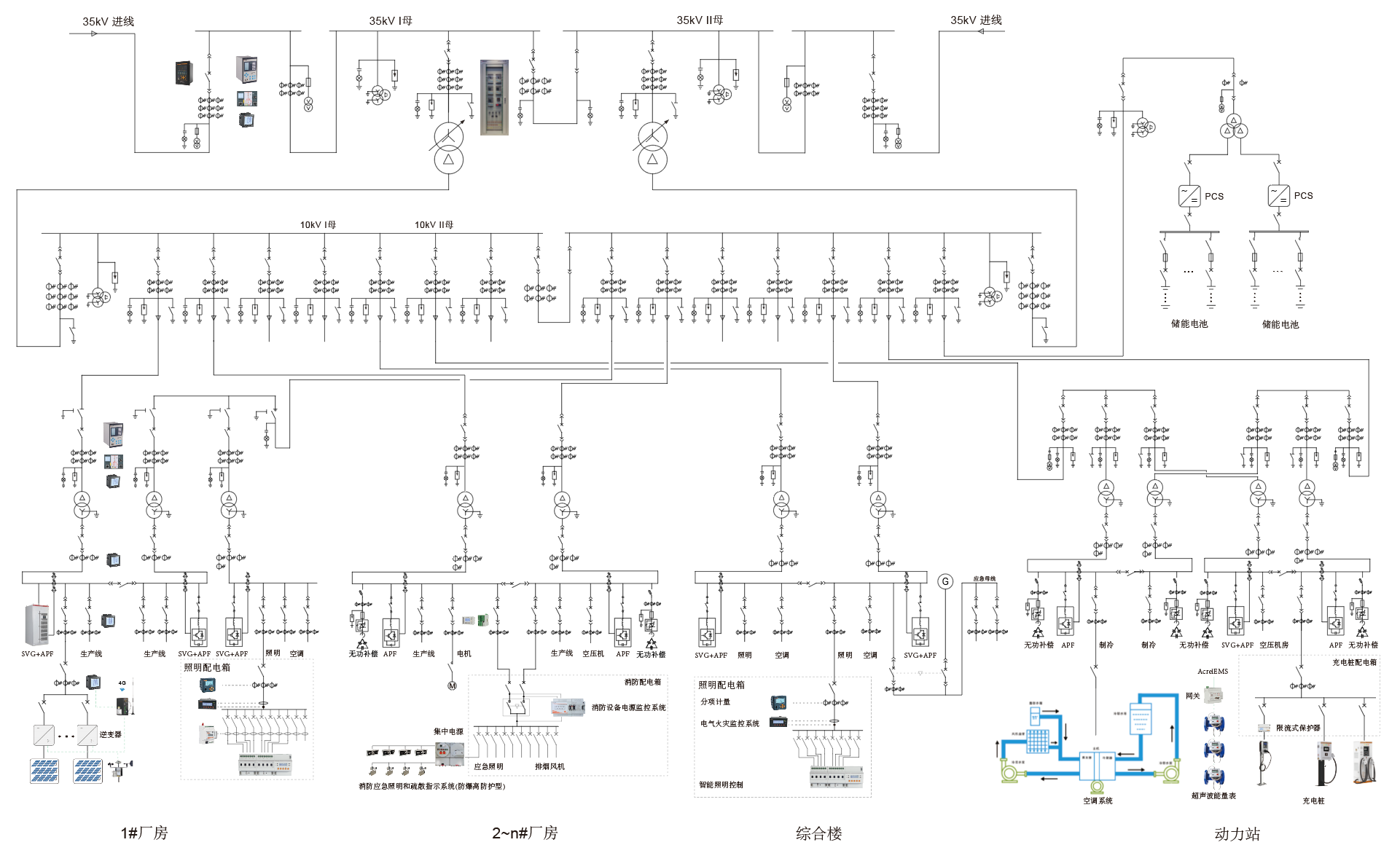 電力監(jiān)控系統(tǒng)主要針對園區(qū)變電站、開閉所和10/0.4kV配電房,對電源進線配置電能質量監(jiān)測裝置實時監(jiān)測進線電能質量,包括電壓閃變、跌落、電壓合格率等數據生成電能質量分析報告。高壓回路配置微機保護裝置進行保護和監(jiān)控,對配電房0.4kV出線配置多功能計量儀表,用于測控出線回路電氣參數和用能情況。同時對變電站(所)內重要設備如柴油發(fā)電機、無功補償裝置、有源濾波裝置、狀態(tài)進行監(jiān)測。