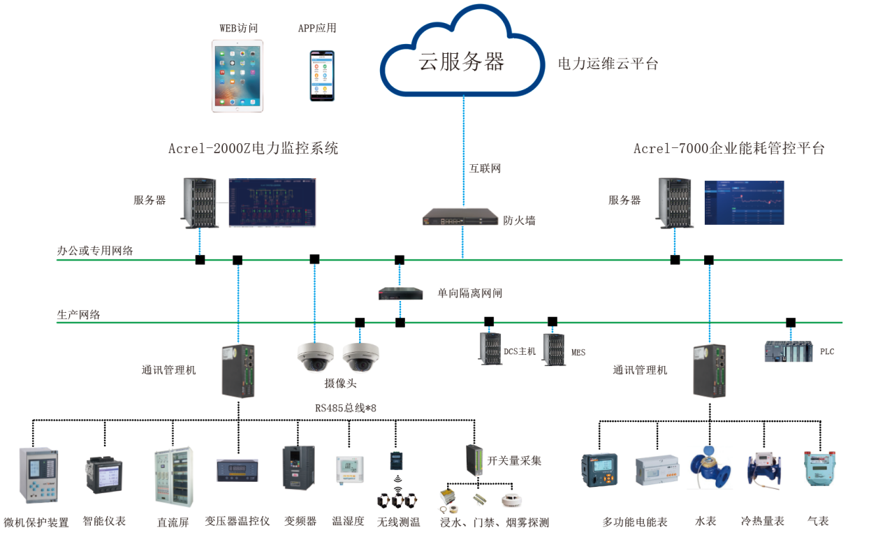 系統(tǒng)采用分布式結(jié)構(gòu),微機(jī)保護(hù)裝置、多功能儀表、變壓器溫控器、直流屏、柴油發(fā)電機(jī)控制屏等設(shè)備通過RS485總線或者以太網(wǎng)接入智能網(wǎng)關(guān),經(jīng)過協(xié)議轉(zhuǎn)換、數(shù)據(jù)處理后上傳至電力監(jiān)控系統(tǒng),實(shí)現(xiàn)遙測(cè)、遙信、遙控、異常報(bào)警等功能。