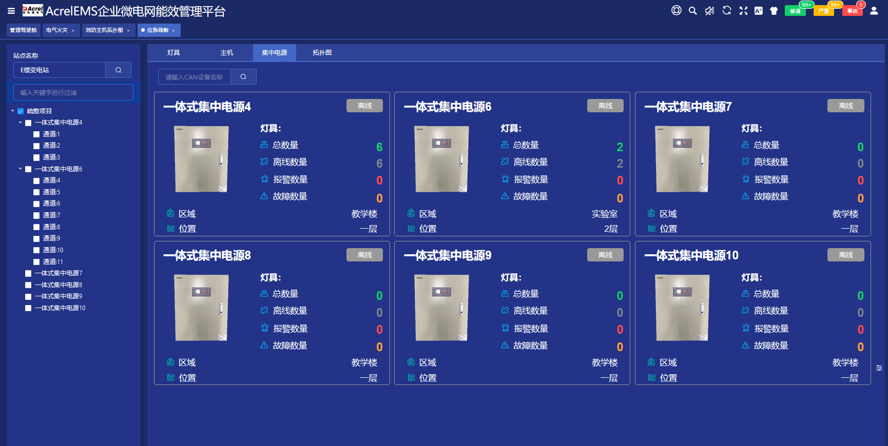 應(yīng)急照明集中電源是安裝在建筑物內(nèi)的備用集中式集中電源裝置。集中電源可以為消防標(biāo)志燈、照明燈供電,保證消防應(yīng)急照明和疏散指示系統(tǒng)正常工作,軟件可分布式顯示現(xiàn)場(chǎng)實(shí)際集中電源各類信息和狀態(tài)。