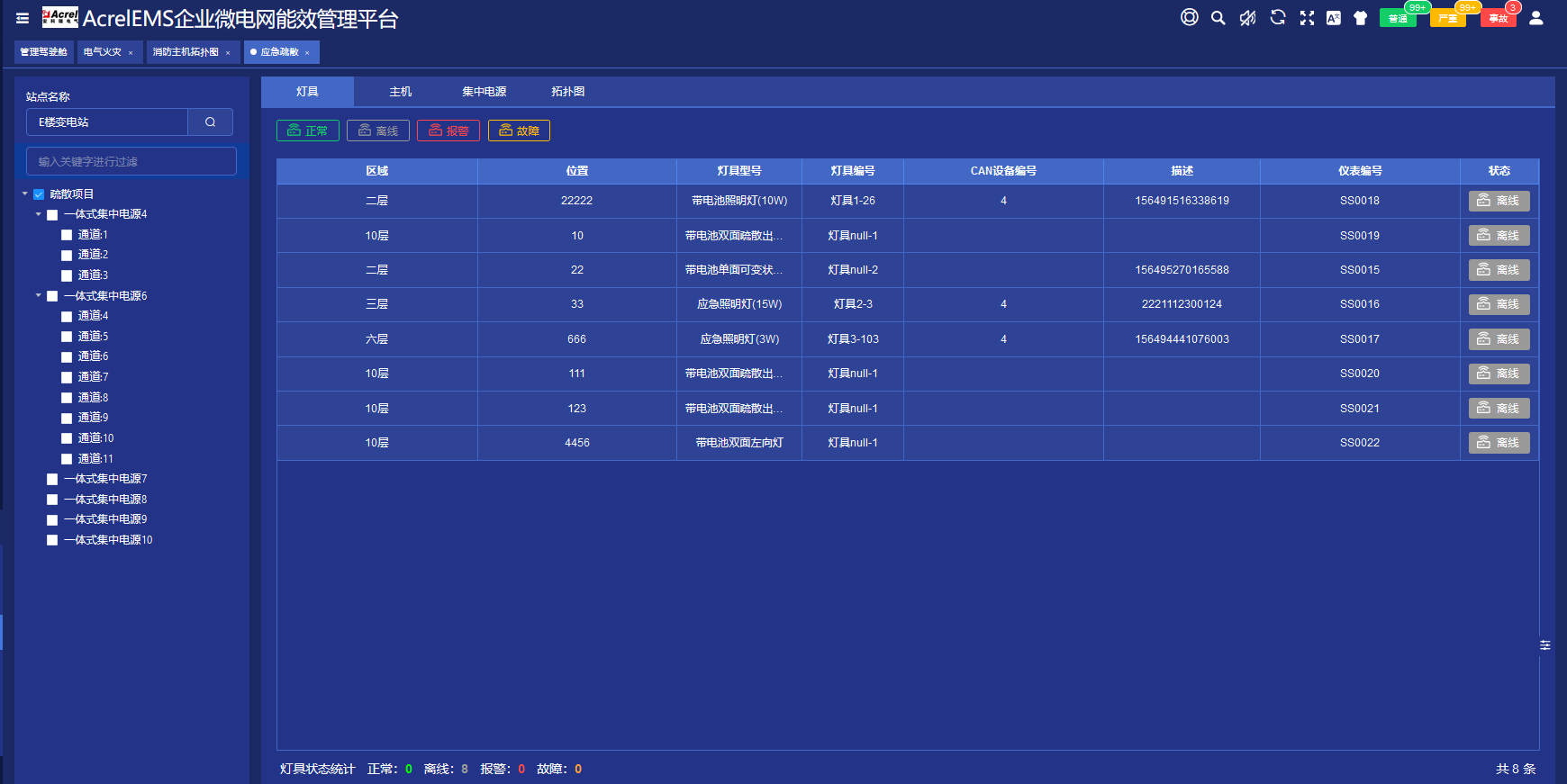 消防應(yīng)急標(biāo)志燈具的主要作用是為人員疏散指引方向,消防應(yīng)急照明燈具的主要作用是為人員疏散逃生提供照明,軟件可實(shí)時(shí)顯示現(xiàn)場(chǎng)燈具的狀態(tài)信息。