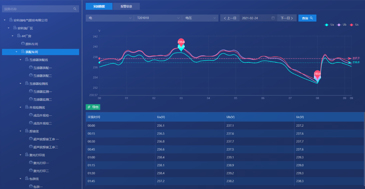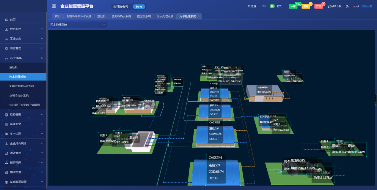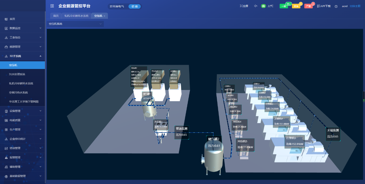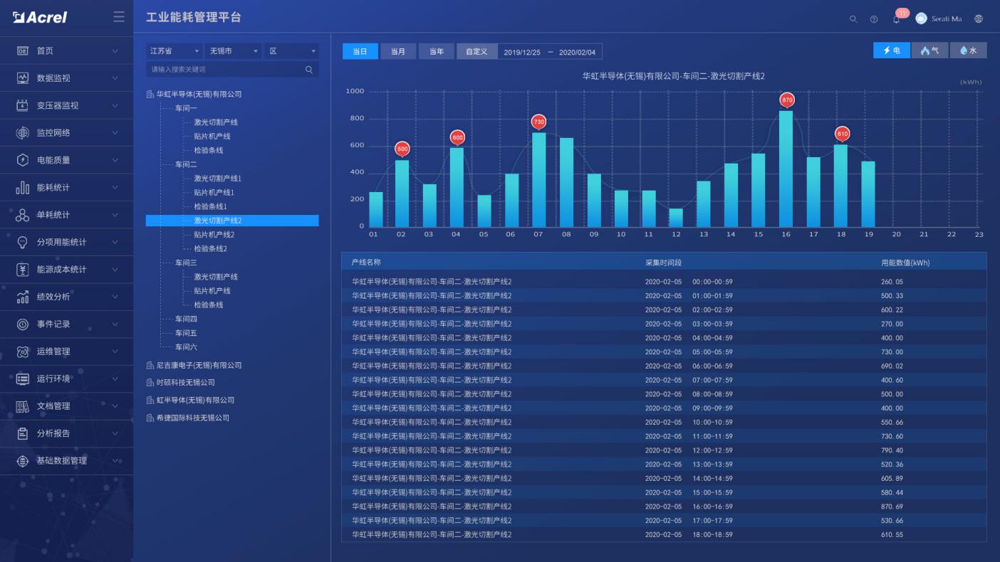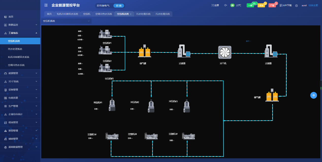 系統(tǒng)對區(qū)域、工段、設(shè)備能源消耗進(jìn)行數(shù)據(jù)采集,監(jiān)測重點(diǎn)設(shè)備及工藝運(yùn)行狀態(tài),如溫度、濕度、流量、壓力、速度等,并支持變配電系統(tǒng)一次運(yùn)行監(jiān)視??芍苯訌膭討B(tài)監(jiān)測平面圖快速瀏覽到所管理的能耗數(shù)據(jù),支持按能源種類、車間、工段、時(shí)間等維度查詢相關(guān)能源用量。