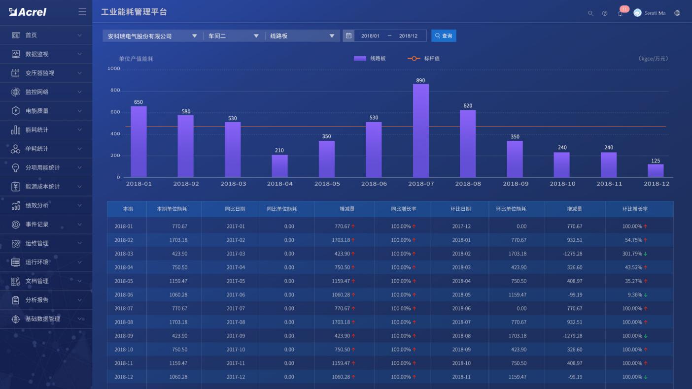 與企業(yè)MES系統(tǒng)對接,通過產(chǎn)品產(chǎn)量以及系統(tǒng)采集的能耗數(shù)據(jù),在產(chǎn)品單耗中生成產(chǎn)品單耗趨勢圖,并進(jìn)行同比和環(huán)比分析。同時(shí)將產(chǎn)品單耗與行業(yè)/國家/國際先進(jìn)指標(biāo)對標(biāo),以便企業(yè)能夠根據(jù)產(chǎn)品單耗情況來調(diào)整生產(chǎn)工藝,從而降低能耗。