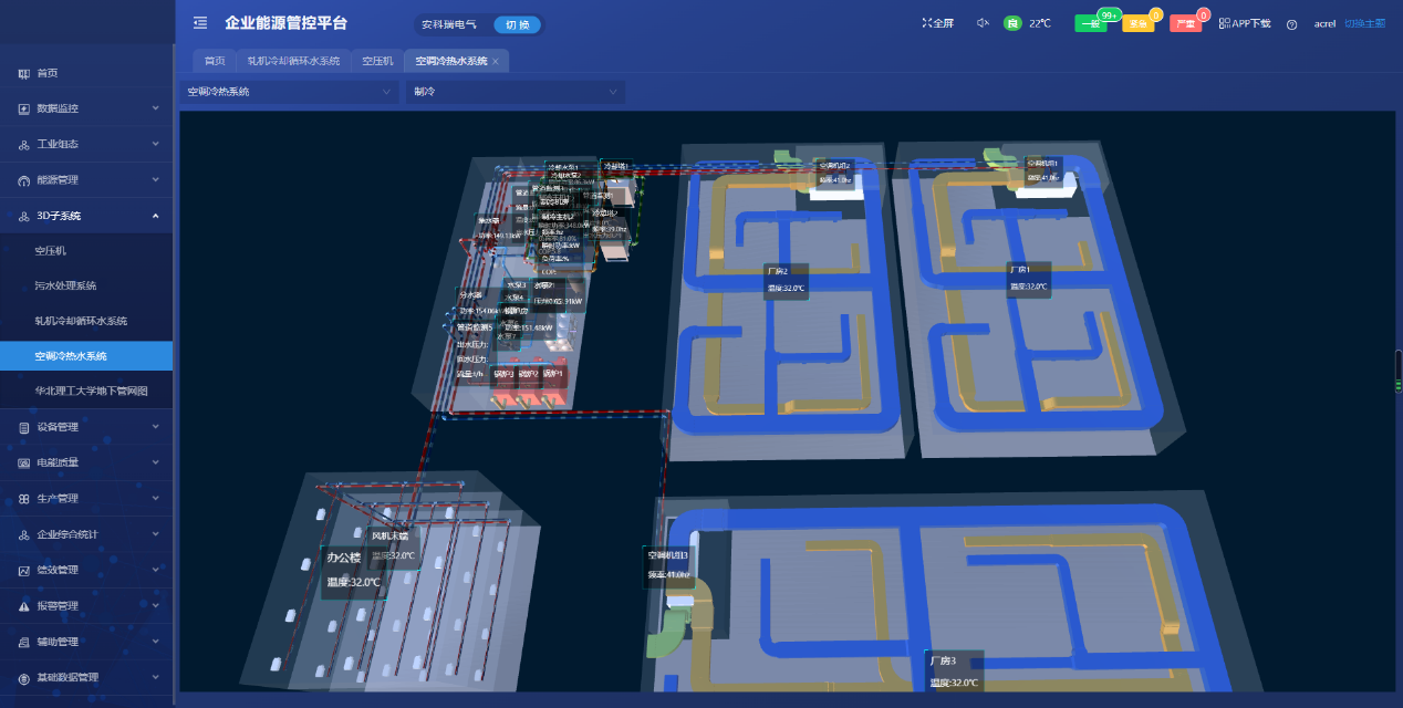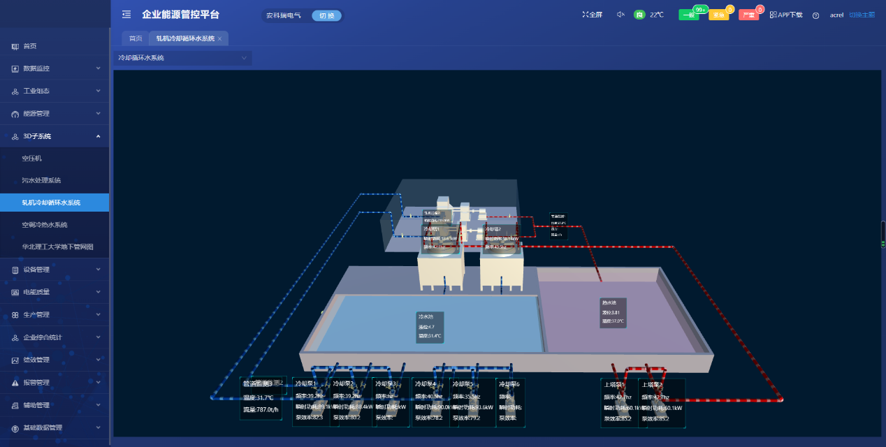 采集廠內(nèi)制冷系統(tǒng)、循環(huán)冷卻水系統(tǒng)、空壓機(jī)系統(tǒng)、污水處理系統(tǒng)等運(yùn)行數(shù)據(jù),可對運(yùn)行能效數(shù)據(jù)、歷史數(shù)據(jù)、實(shí)時(shí)數(shù)據(jù)、累計(jì)電量、功率、分時(shí)段(年、月、周、日)電量及功率進(jìn)行展示對比分析。