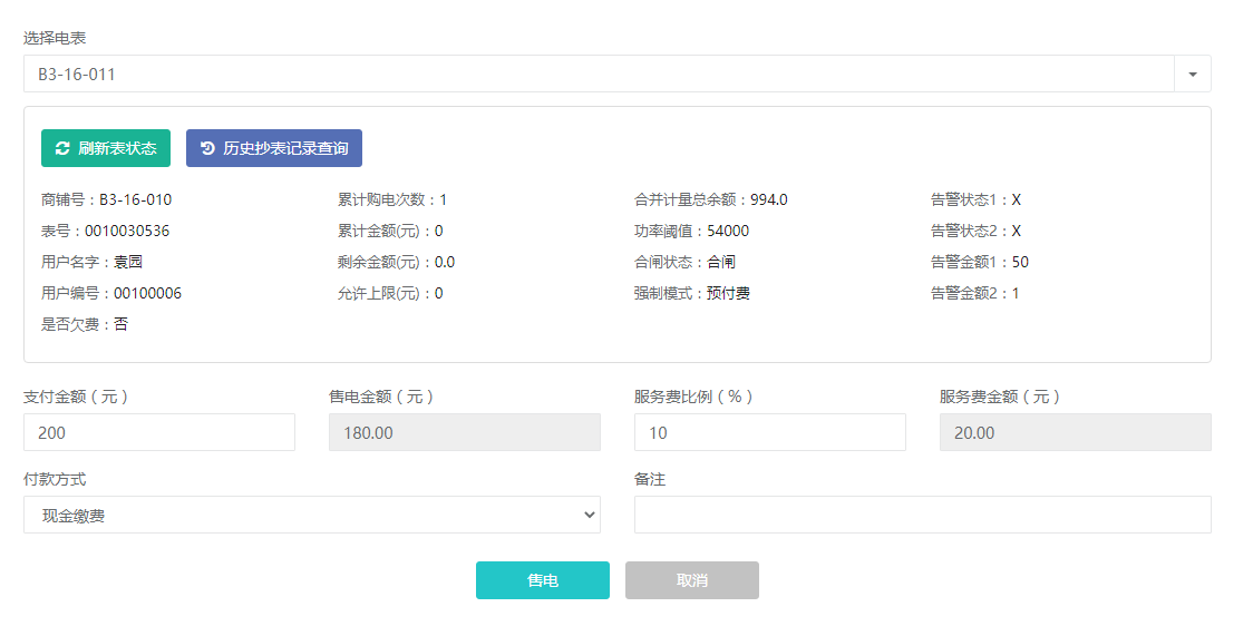 可以對已開戶的電表進(jìn)行遠(yuǎn)程售電,電費(fèi)實(shí)時(shí)下發(fā)到電表,電表會根據(jù)電度走字實(shí)時(shí)扣除電費(fèi)。售電可以設(shè)置服務(wù)費(fèi)比例,實(shí)際充值到表中的金額將按比例扣除服務(wù)費(fèi)之后再下發(fā),作為物業(yè)增加收取服務(wù)費(fèi)的渠道。