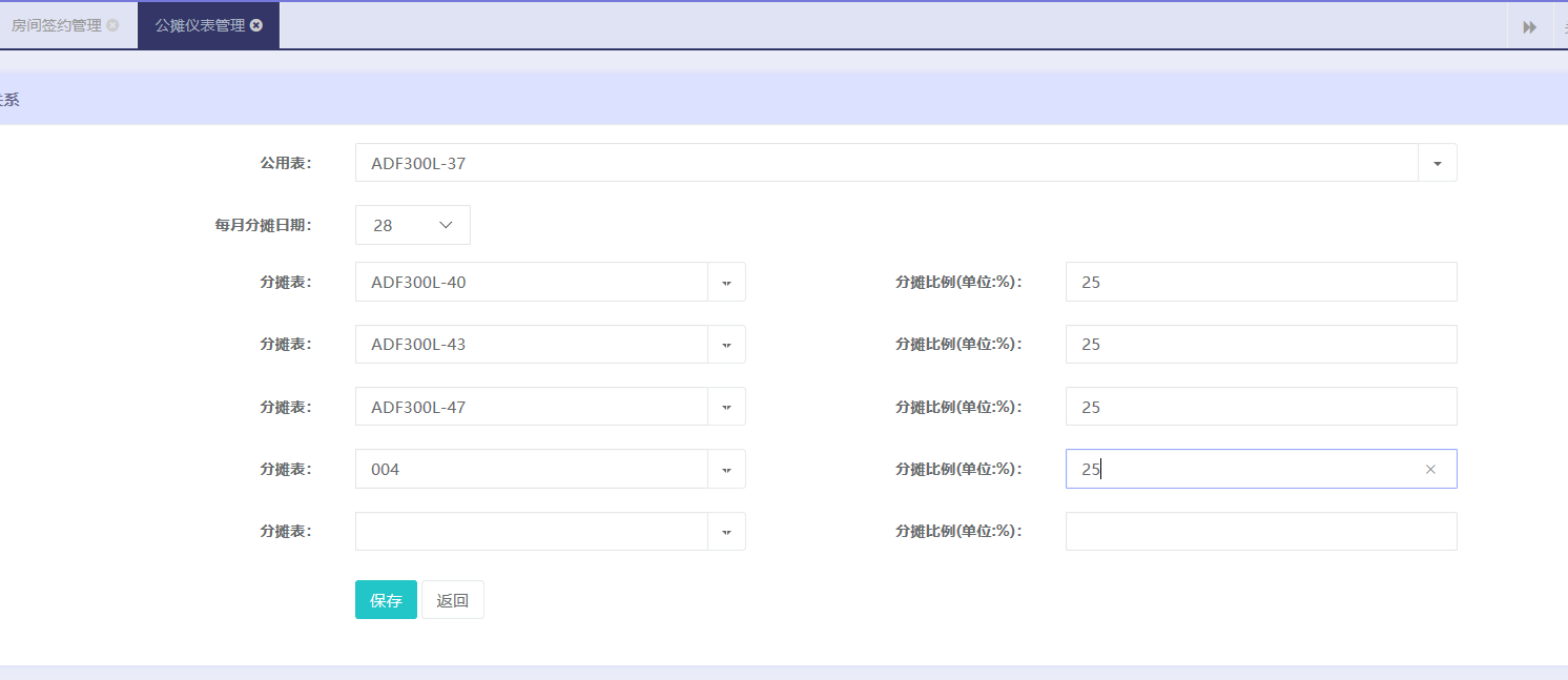 指定某塊表為主表,然后分配關(guān)聯(lián)子表,系統(tǒng)每個(gè)月自動將主表的用電按比例換算成電費(fèi)從子表中扣除,這樣可以剩余人工統(tǒng)計(jì)的麻煩。