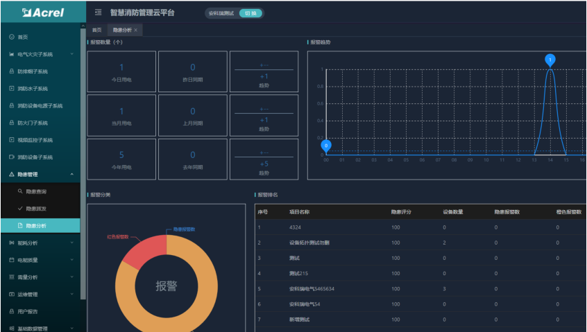 該子系統(tǒng)可以接入電氣火災(zāi)、孤航電弧、電氣火災(zāi)主機(jī)、滅弧式保護(hù)器探測(cè)和無(wú)線測(cè)溫探測(cè)等。點(diǎn)擊電氣火災(zāi)子系統(tǒng)進(jìn)入電氣火災(zāi)監(jiān)控頁(yè)面,如圖所示。