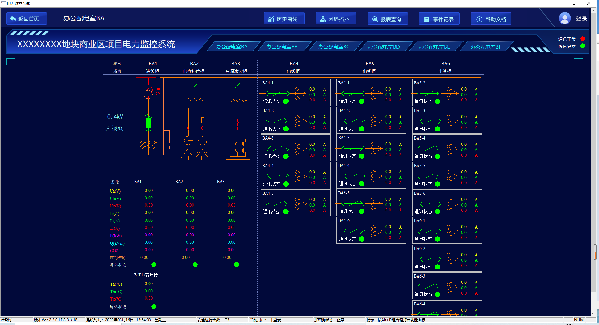 系統(tǒng)人機(jī)界面友好,以配電一次圖的形式直觀顯示配電線路的運(yùn)行狀態(tài),實(shí)時(shí)監(jiān)測各回路電壓、電流、功率、功率因數(shù)、電能等電參數(shù)信息,動態(tài)監(jiān)視各配電回路斷路器、隔離開關(guān)、地刀等合分狀態(tài)、柴油發(fā)電機(jī)狀態(tài)、柴油液位、UPS狀態(tài)、電池信息等,以及有關(guān)故障、告警等信號。